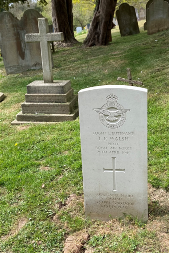Flt. Lt. Walsh was stationed at No 2 Flying Instructors School, RAF Stracathro, Angus, Scotland when, on 29th April 1945 his Airspeed Oxford training aircraft crashed and he and his pupil Flying Officer Bull were both killed, nine days before the end of the war in Europe.