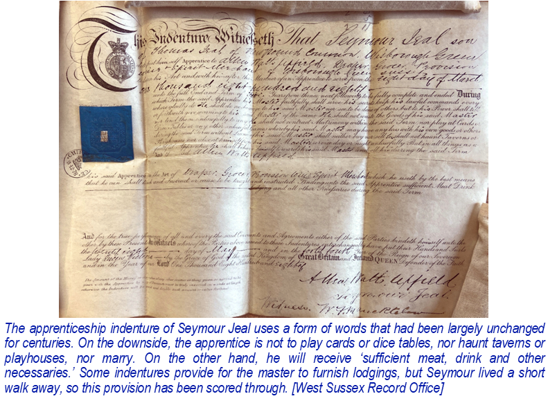 In June’s edition of Ad Vincula we were introduced to Allen Watts Upfield, successful shopkeeper, community leader and man of property. No doubt he employed several apprentices over the years and the indenture for one of them, Seymour Jeal, survives in the West Sussex Record Office, together with a small number of family papers. Here, we learn a little more about Seymour Jeal.